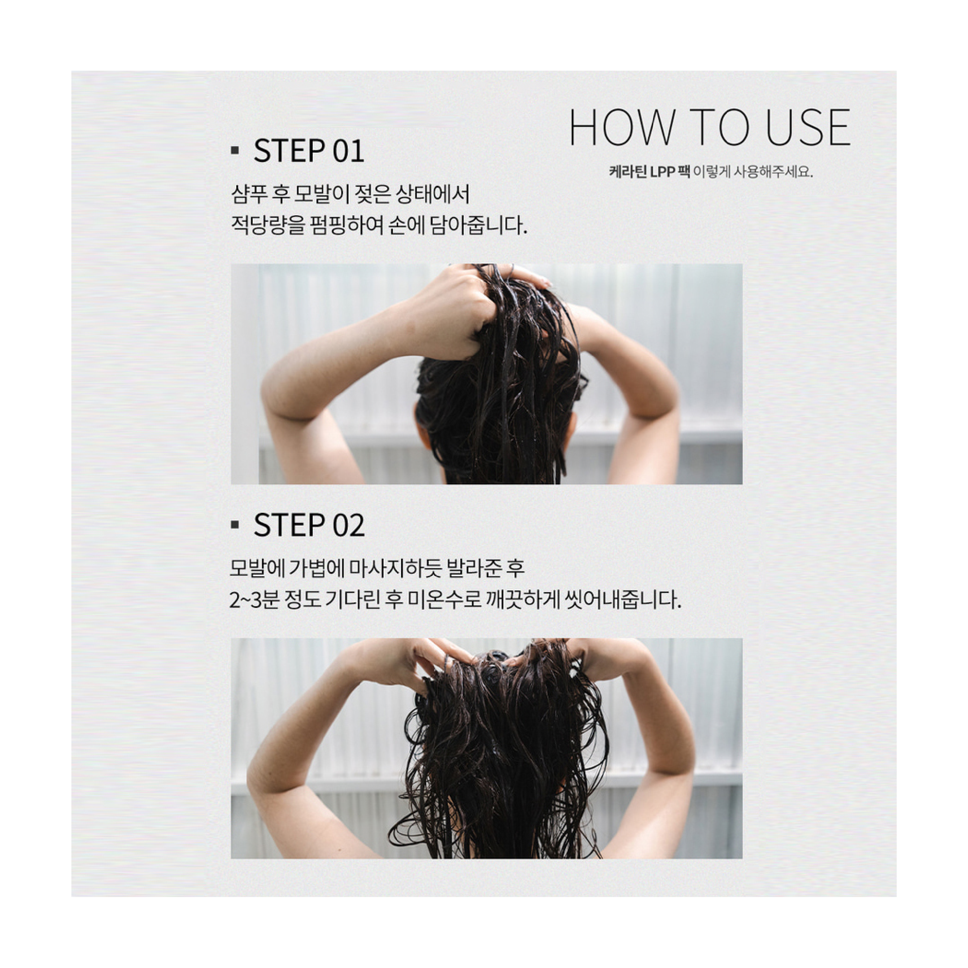 หลังสระผมแล้ว ให้เช็ดผ้าขนหนูให้แห้งเพื่อซับน้ำออกให้มากที่สุด นวดเบาๆ บริเวณผมที่เสียหายให้ทั่ว ทิ้งไว้ 2-3 นาที แล้วล้างออกให้สะอาด (สามารถใช้เป็นทรีตเมนต์ก่อนสระผมได้อีกด้วย)