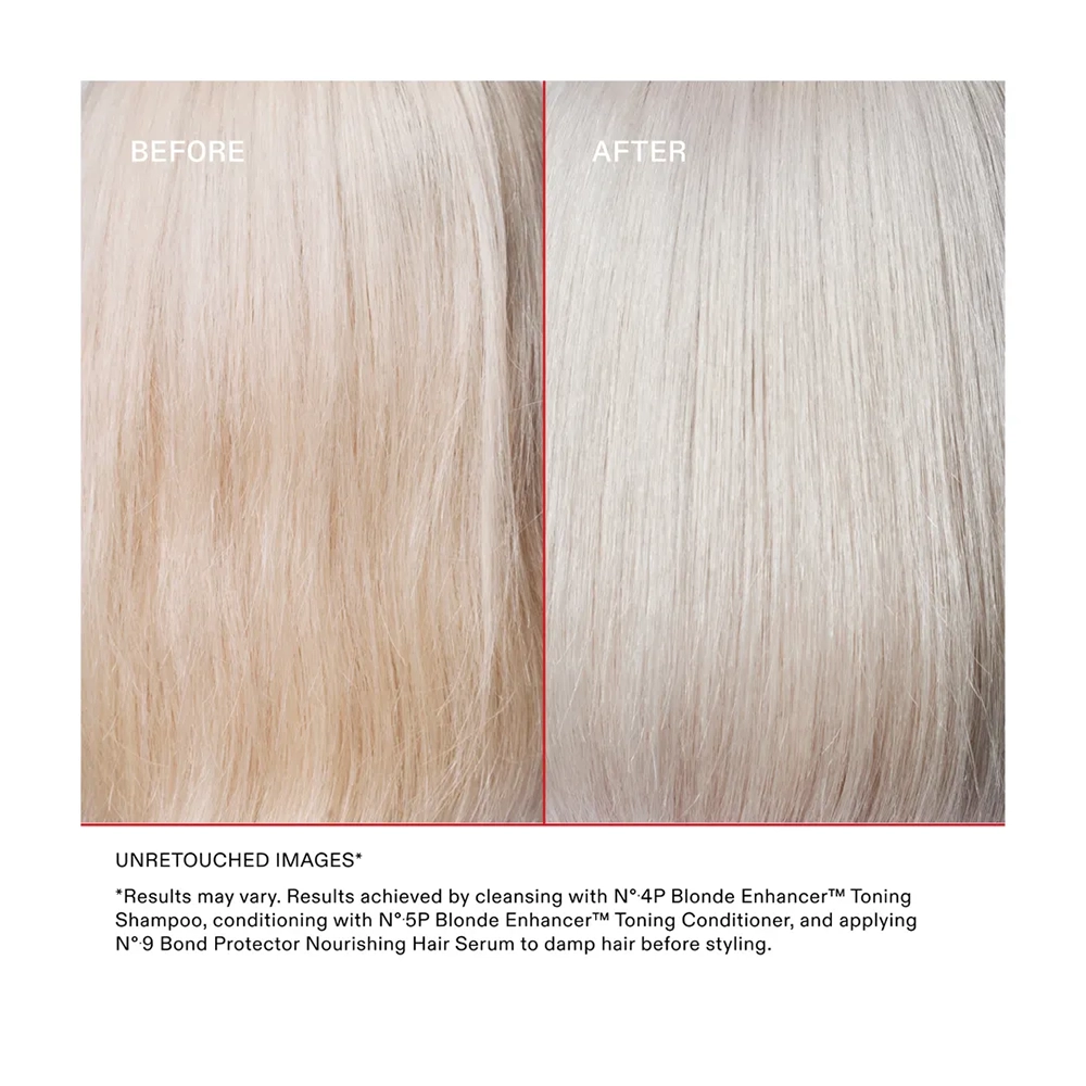 ผลลัพธ์ที่ได้ : OLAPLEX No.5P Blonde Enhancer™ Toning Conditioner ทิ้งผมขาดชีวิตชีวา แห้ง ผมบลอนด์และเทาทองเหลืองไว้ในอดีต อนาคตแห่งผมบลอนด์ที่สว่าง นุ่ม เงางามและชุ่มชื้นได้เกิดขึ้นแล้ว No.5P Blonde Enhancer™ Toning Conditioner ไม่เพียงแต่เป็นคอนดิชันเนอร์สีม่วง ส่วนผสมจากพิกเมนต์ละเอียด ช่วยบำรุงเส้นผมจากโคนจรดปลาย ช่วยล็อคความสว่าง ปรับแก้โทนสีผมเหลืองและบำรุงเส้นผมโดยไม่ทำให้โคนผมลีบแบน Olaplex Bond Building Technology™ ช่วยให้เส้นผมแข็งแรง สีบลอนด์และเทาสุขภาพดี พิกเมนต์อณูละเอียด ล็อคความสว่างโดยมอบเม็ดสีที่ปรับสมดุลโทนสี เพื่อเติมเต็มถึงบริเวณที่มีรูพรุนของหนังกำพร้าที่ซึ่งแชมพูไม่สามารถเข้าถึงได้ เพื่อให้ผมสุขภาพดี Olaplex Bond Building Technology™ ช่วยให้เส้นผมแข็งแรง ผมสีบลอนด์และเทาสุขภาพดี ฟื้นบำรุงผมเปราะขาดง่ายและผมเสีย